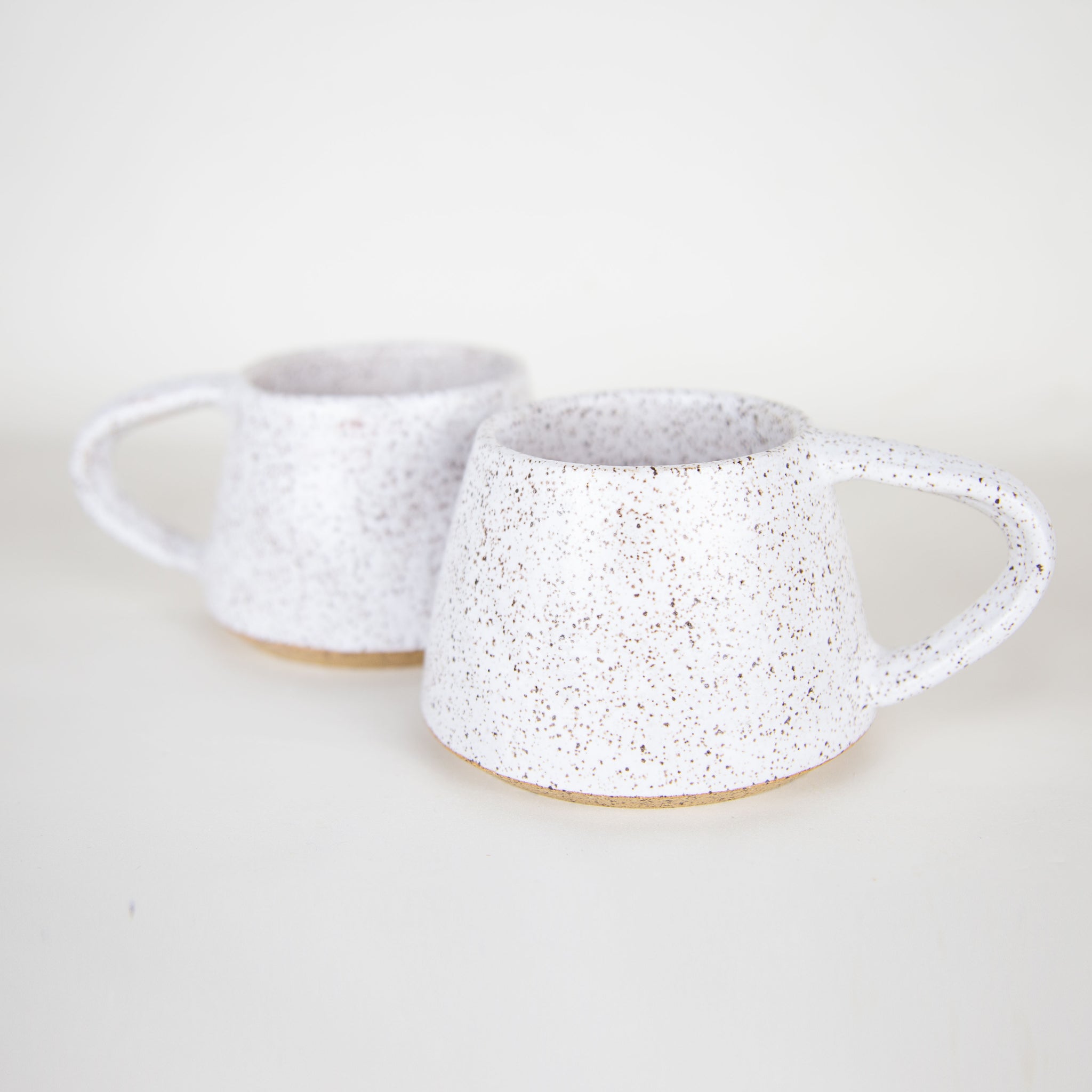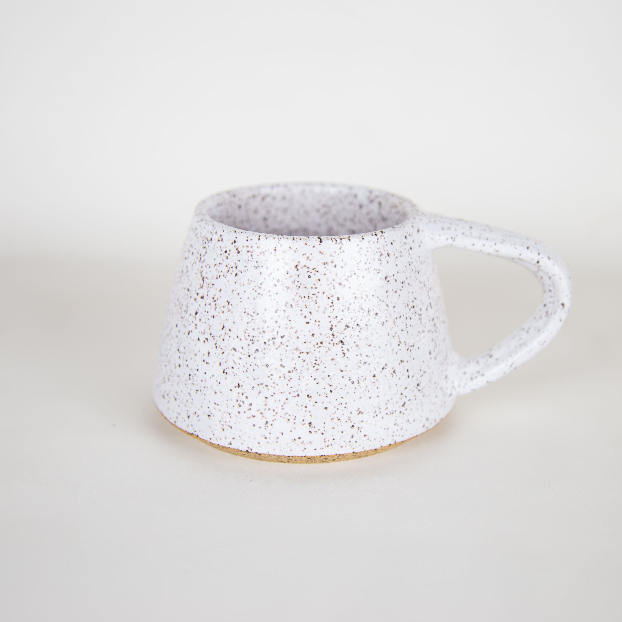 Handled tapered mug in white speckle. Hand thrown on the pottery wheel. Holds 8oz of liquid. Sizes and color vary.