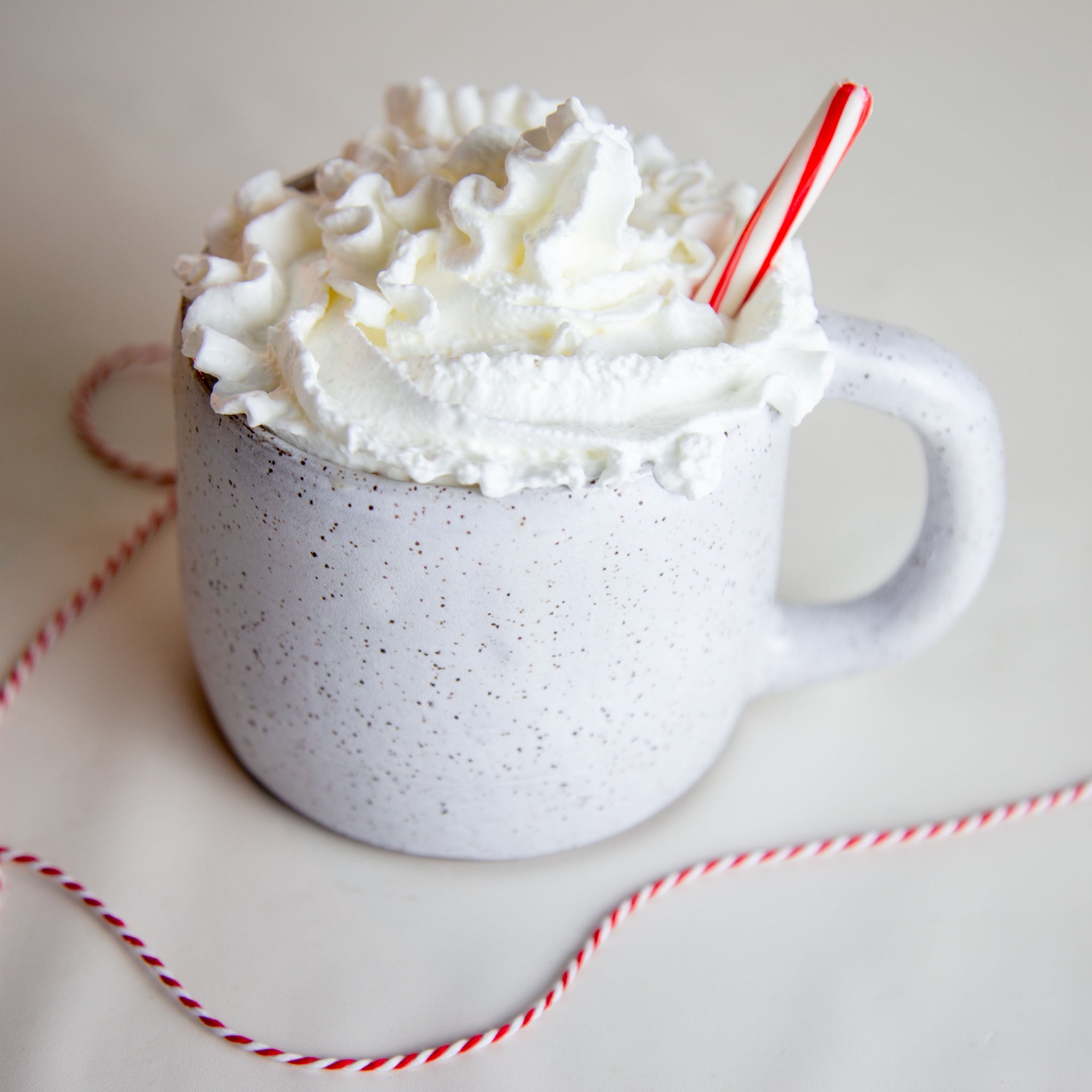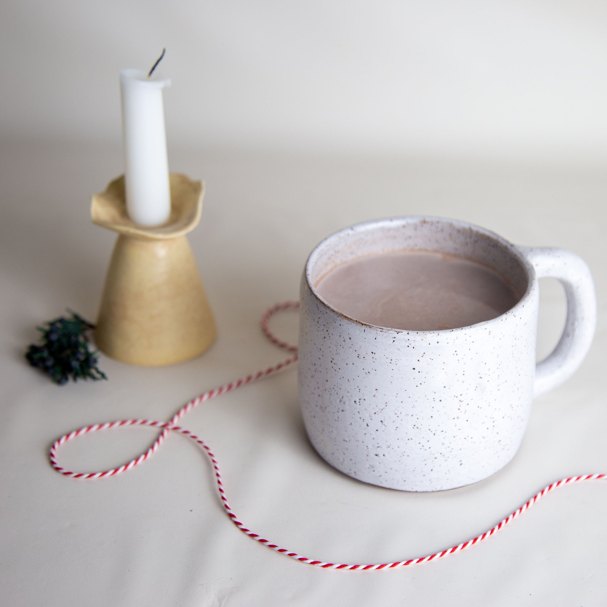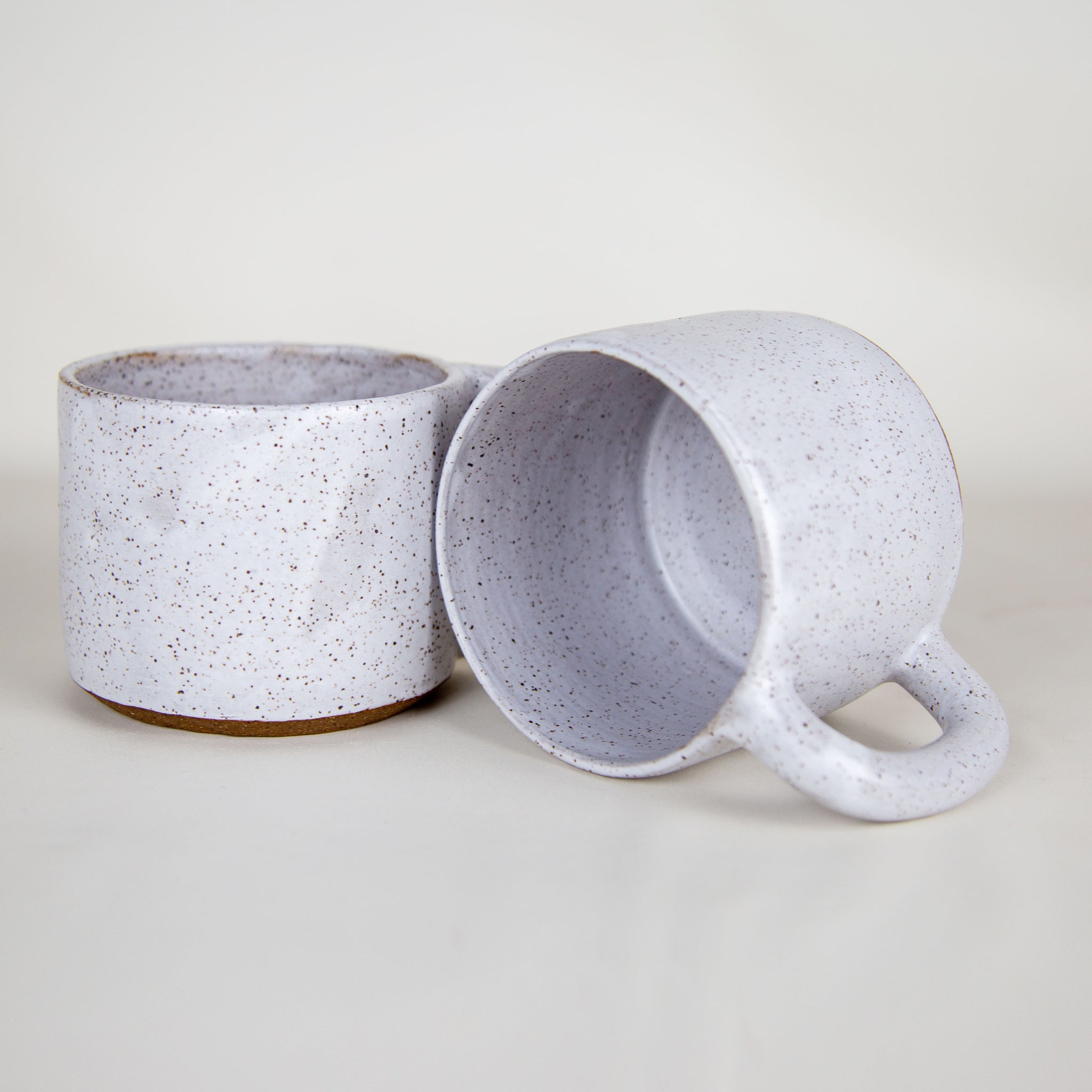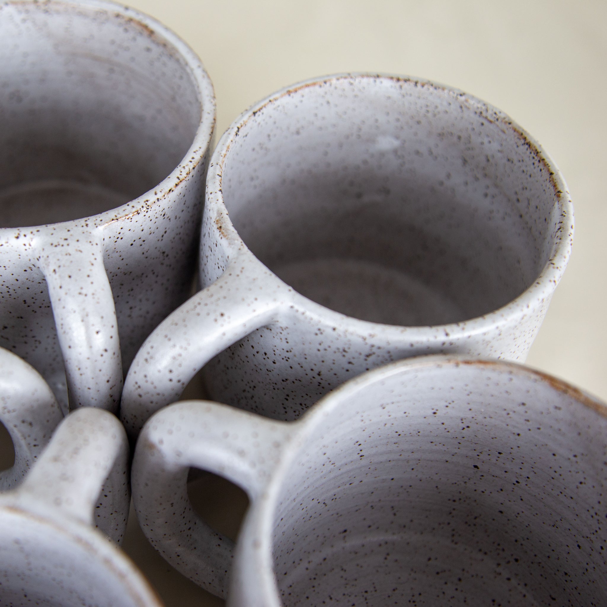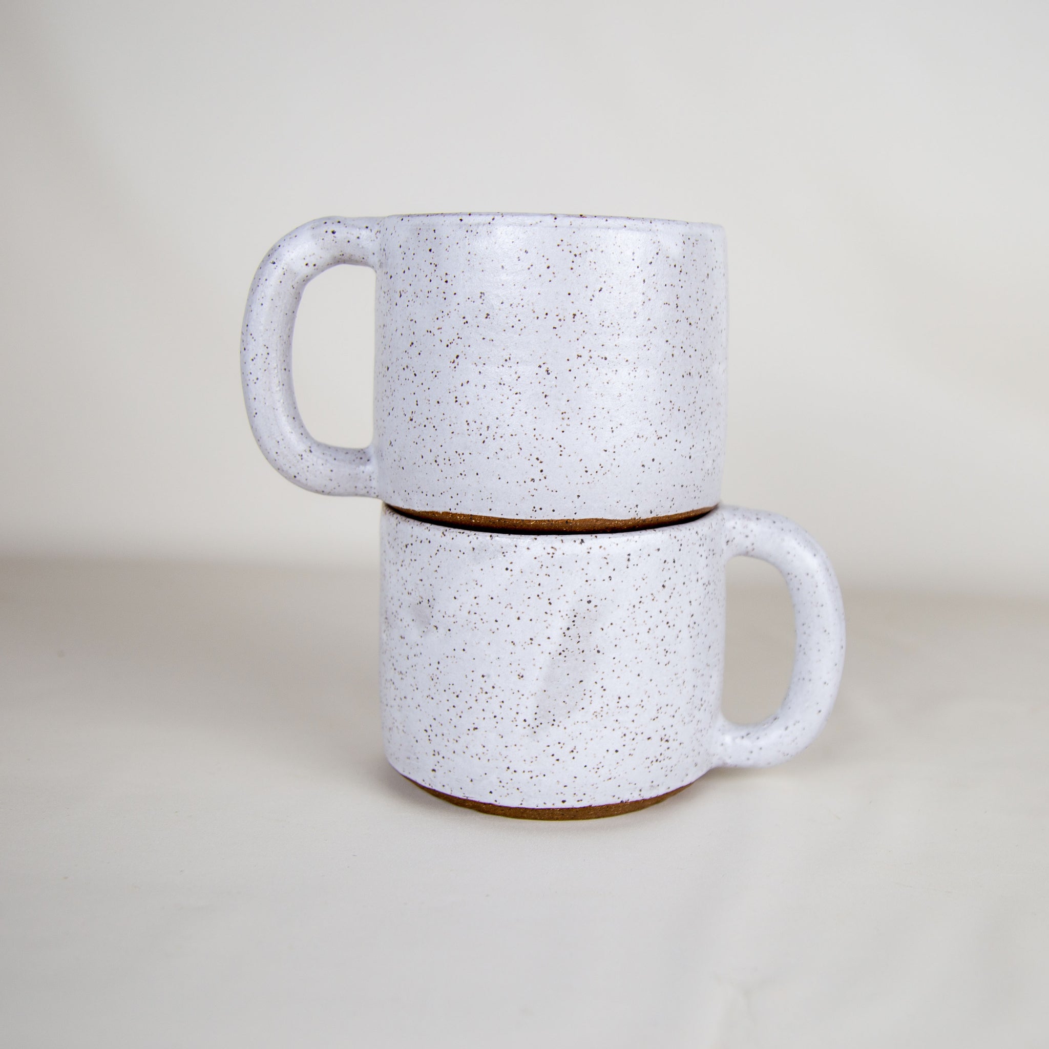 Handled mug in white speckle. Hand thrown on the pottery wheel. Holds 16oz of liquid. Sizes and color vary.